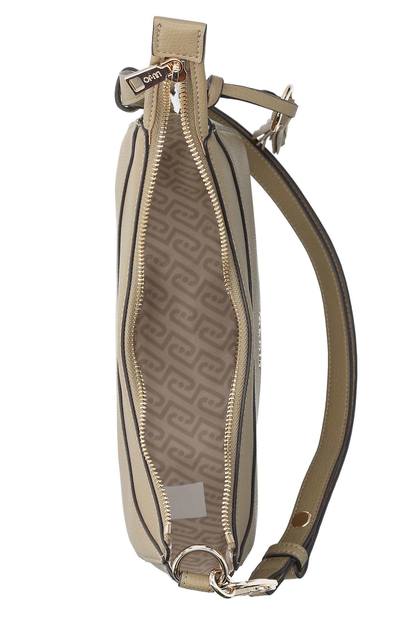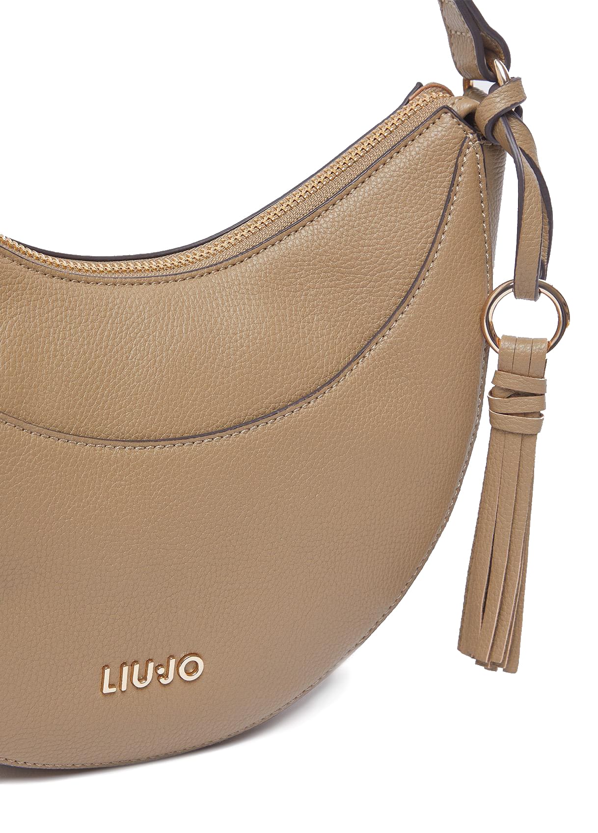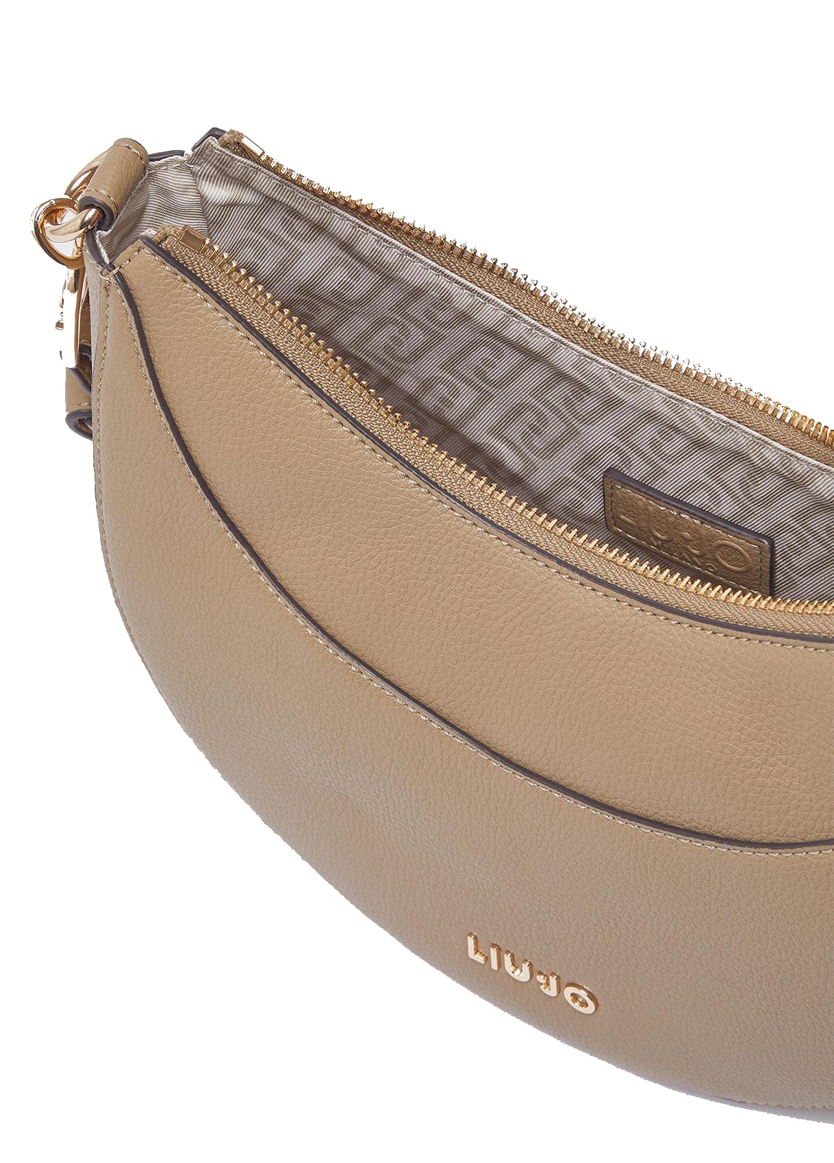 Este bolso destaca por su resalto con logotipo y su forma de media luna, mostrado en color marrón. Un modelo audaz que puede llevarse a mano o cruzado gracias a la correa desmontable.
