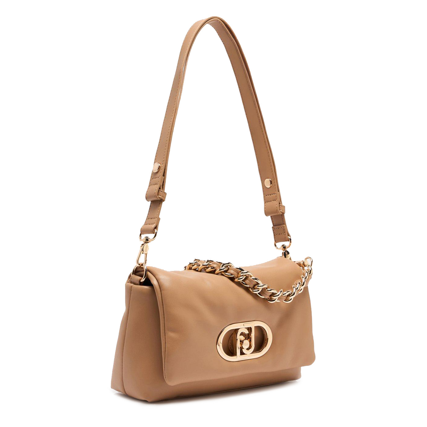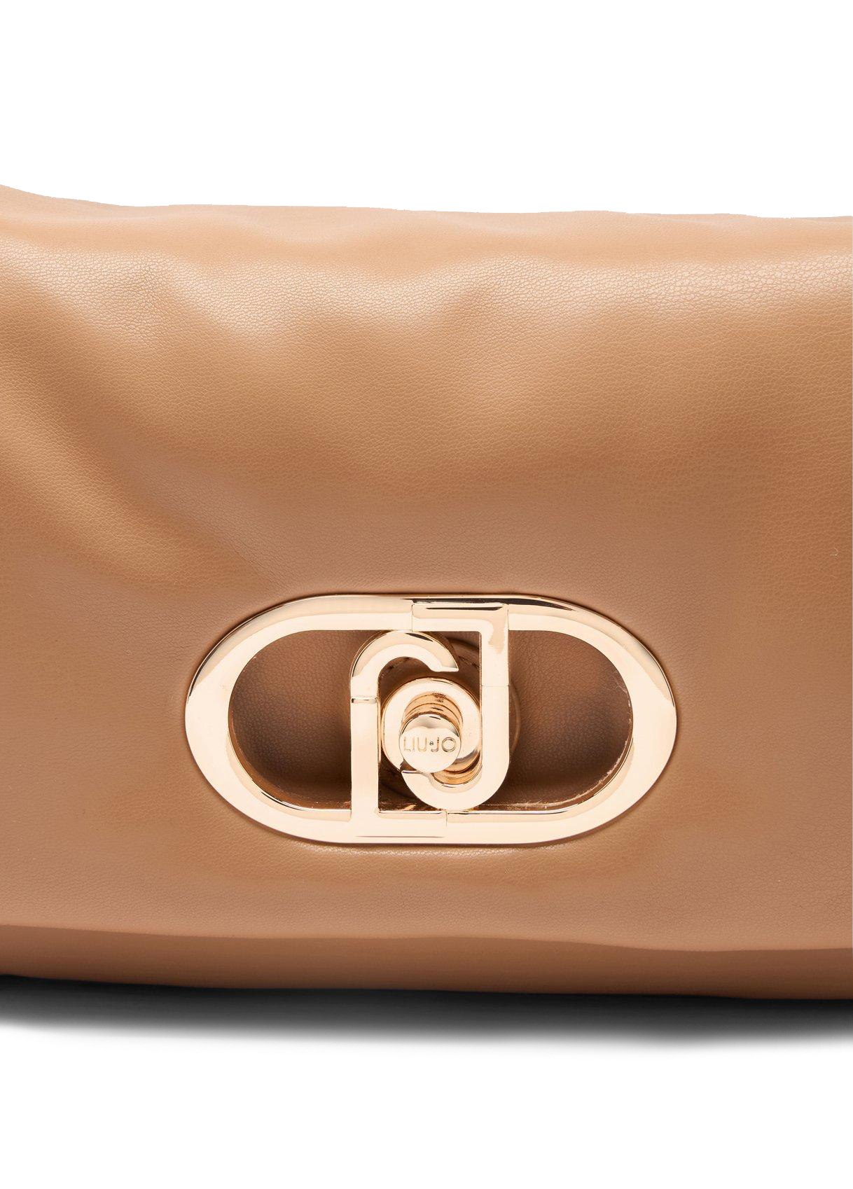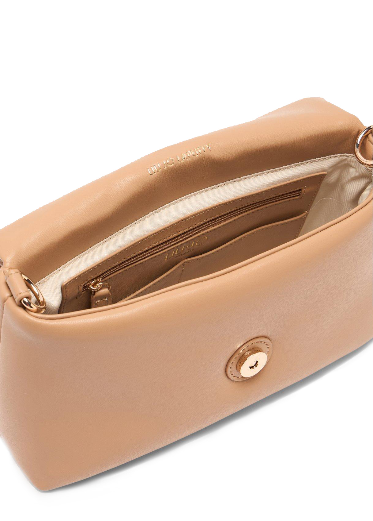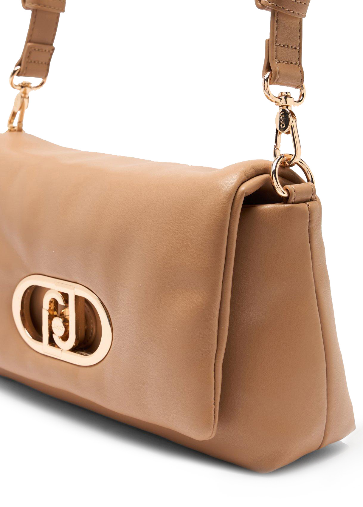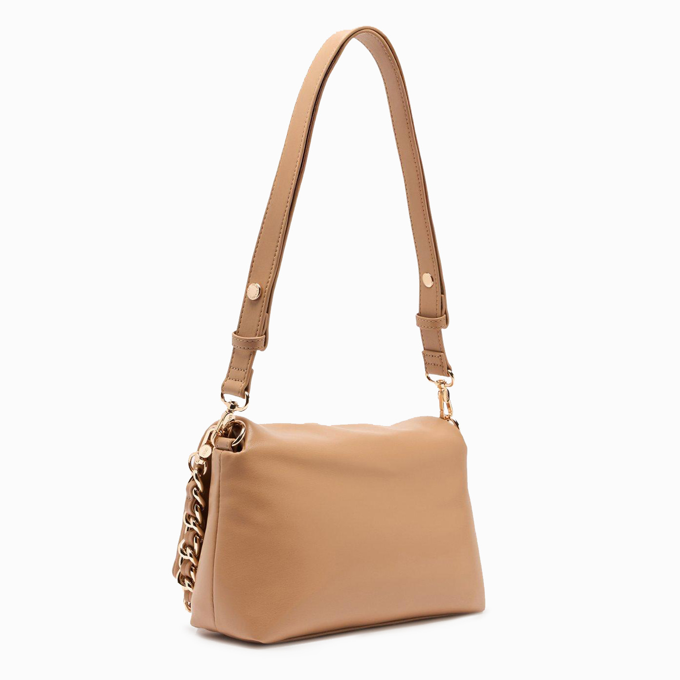 Este bolso destaca por sus textura acolchada y su forma cuadrada, mostrado en color neutro con detalles dorados. Un modelo audaz que puede llevarse al hombro o cruzado gracias a la correa desmontable.