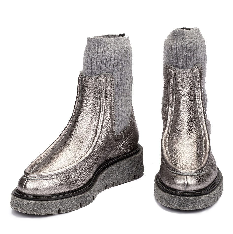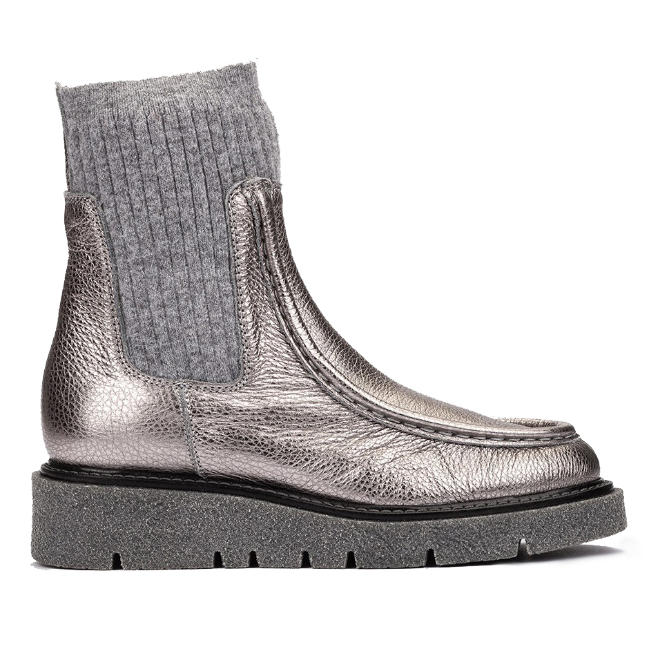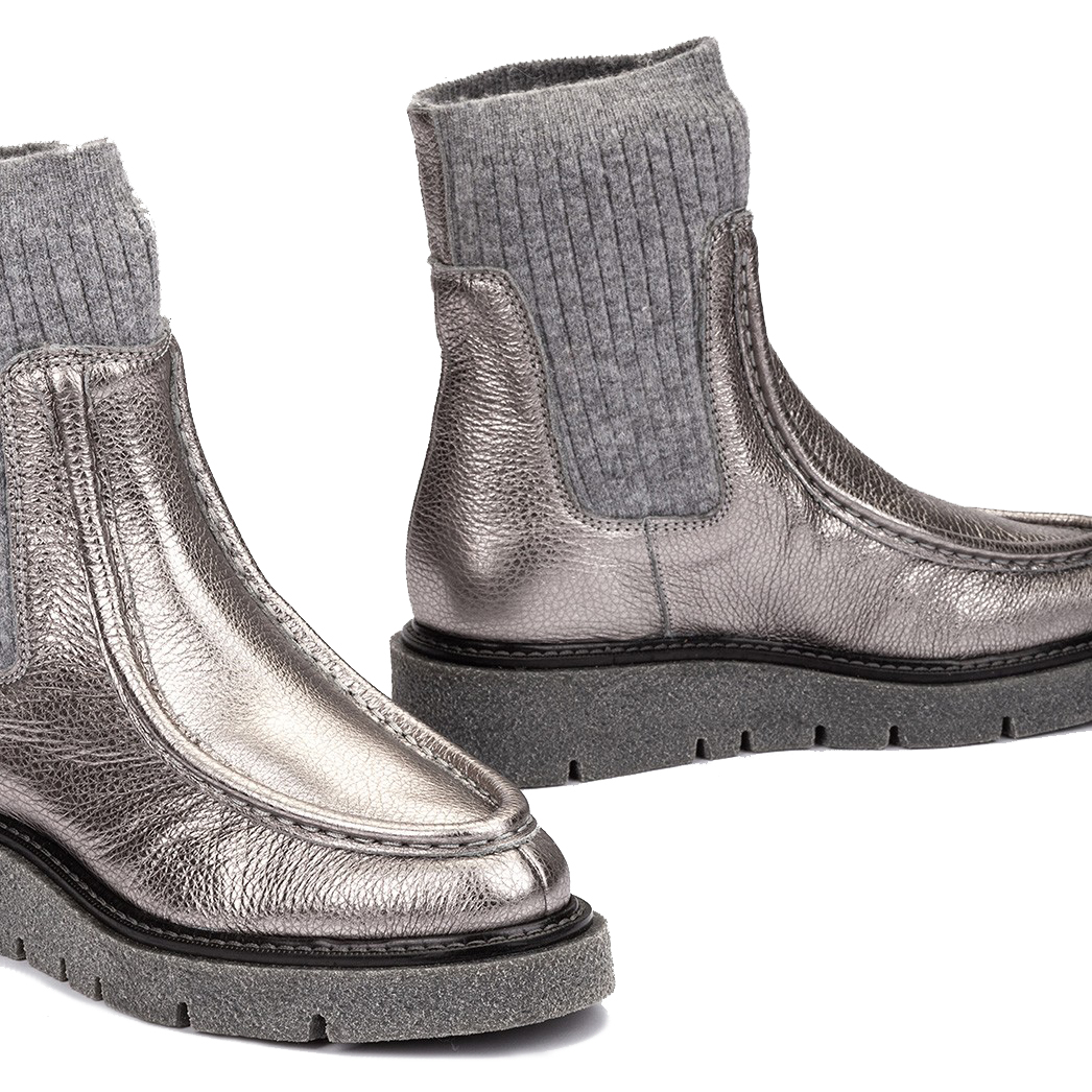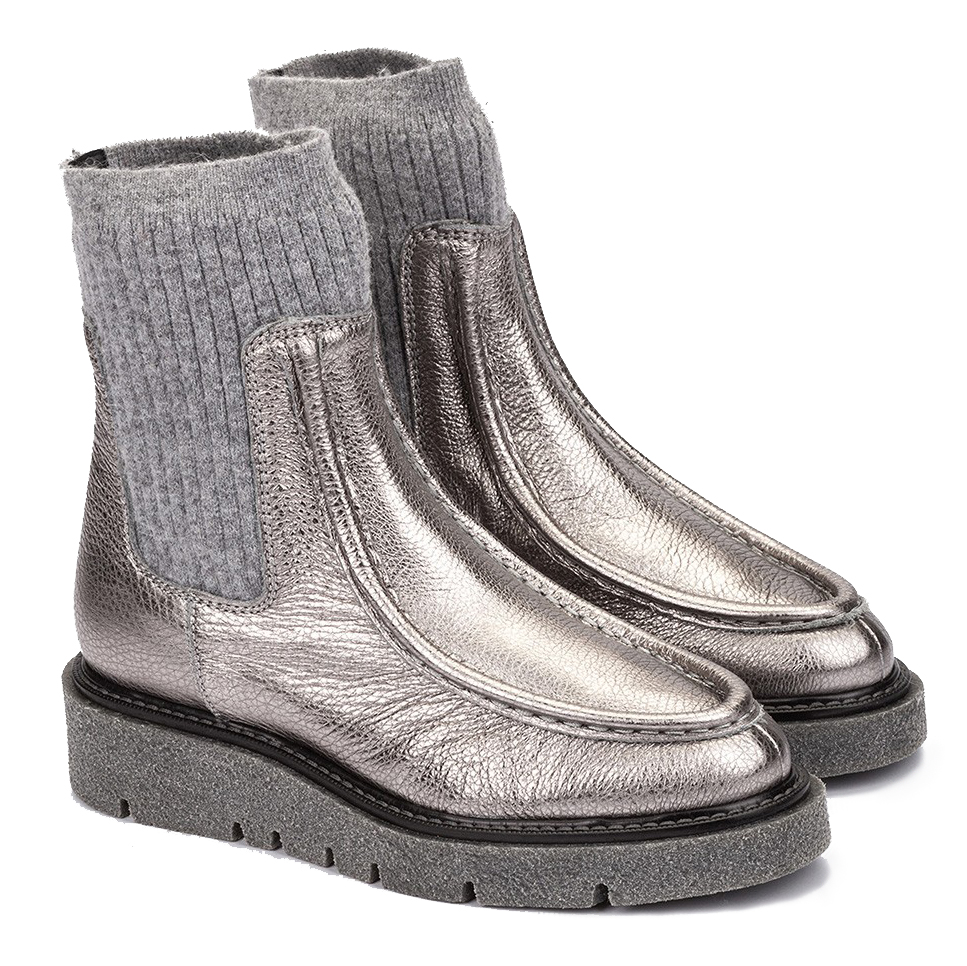 Botines de piel metalizada con tejido oscuro. El diseño de los botines Patagonia se ajusta perfectamente al pie, abrazándolo con comodidad y sofisticación. Un modelo idóneo para frioleras, disfruta de él todo el invierno, ya sea en el pueblo, en la ciudad, en momentos de ocio o de trabajo.