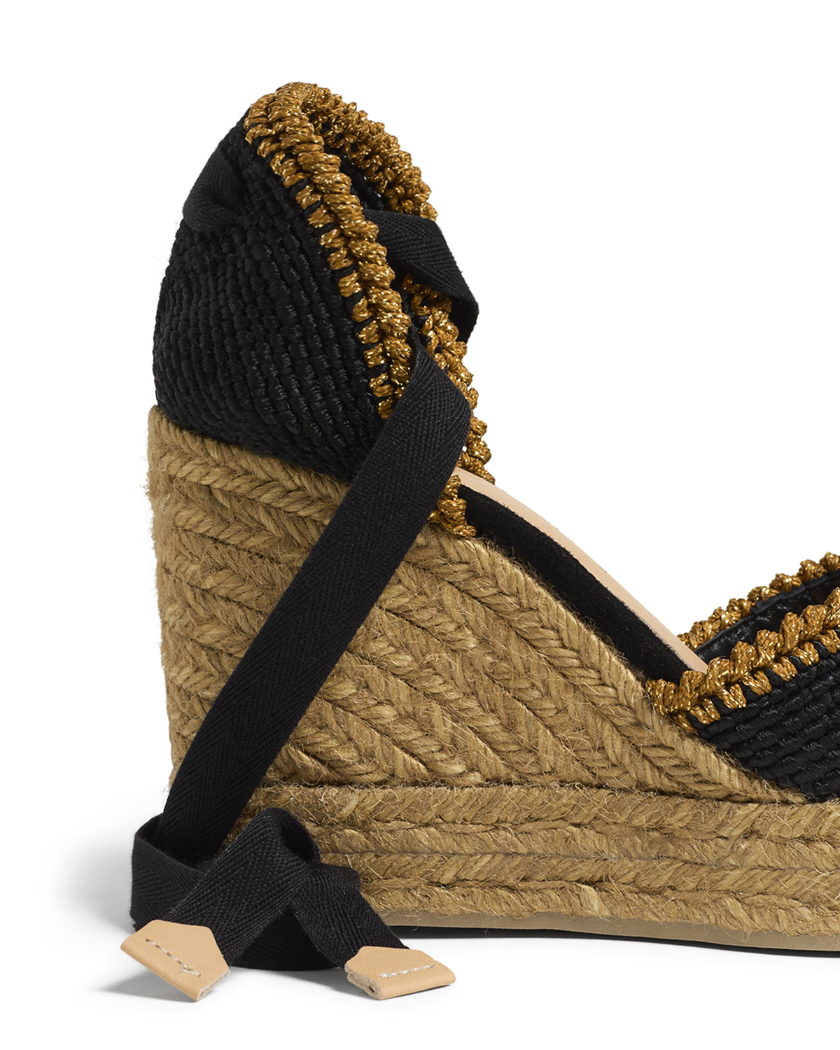 Las alpargatas Coeur presentan puntera cerrada redondeada, cierre mediante lazada, cuña de 11cm con doble plataforma de yute y suela de caucho vulcanizado.