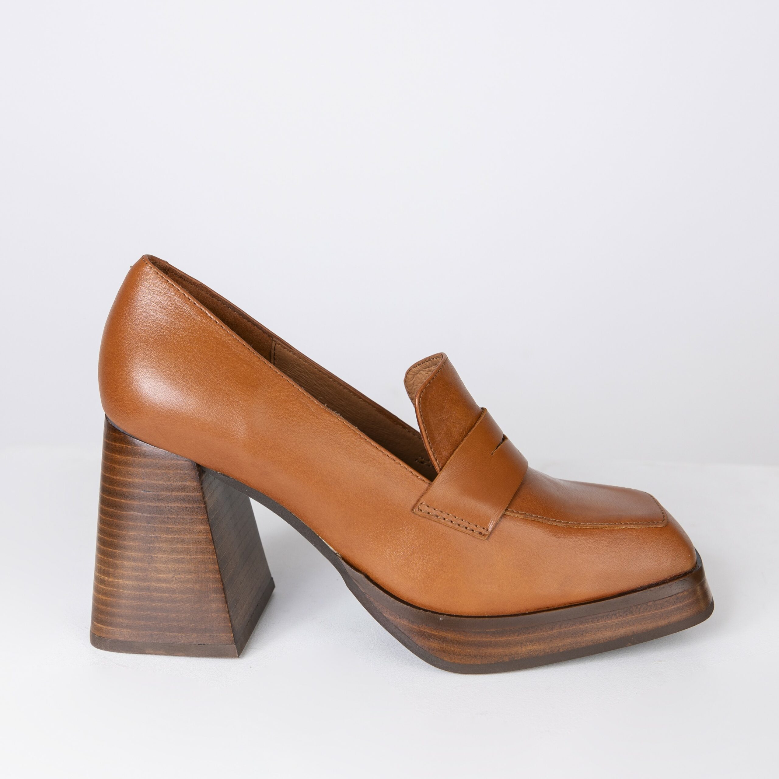 Mocasines marrones de mujer con tacón ancho, alto y con plataforma.