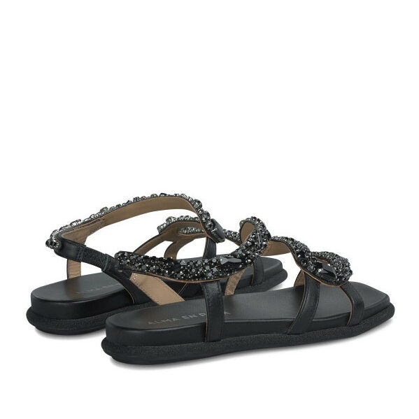 Las sandalias NAPA es un modelo muy cómodo que tiene la plantilla acolchada, con tiras de pedrería entrelazada y con detalles de brillos haciendo la forma de una serpiente. Además, se sujeta muy bien el pie gracias a su puntera cuadrada y el cierre con goma.